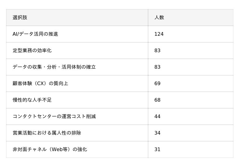 経営・事業課題についての設問では、「慢性的な人手不足(68件)」や「定型業務の効率化(83件)」といった守りの課題を抑え、「AI/データ活用の推進」が124件(回答者の60.5%)で最多となりました。 また、「データの収集・分析・活用体制の確立」も「定型業務の効率化」と同数の83件に達しています。