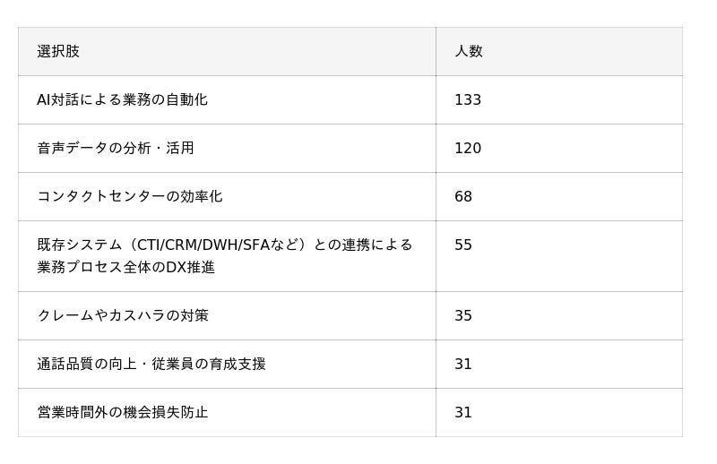 アイブリーのソリューションに対し魅力に感じた点として、「AI対話による業務の自動化(133件)」に次いで、「音声データの分析・活用(120件)」が高い数値を記録しました。 この僅差の結果は、電話対応の自動化によるコスト削減だけでなく、通話データを可視化・分析し、経営やマーケティングに活かそうとする「攻めのAI活用」への期待が、企業の関心事として存在していることを示しています。