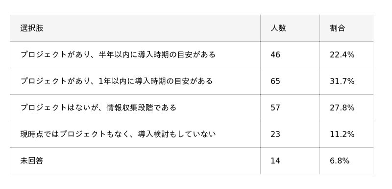 DX/AI活用に関する検討状況では、全体の半数以上 が「1年以内に導入時期の目安がある」もしくは「半年以内に導入時期の目安がある」と回答しました。「情報収集段階」の企業(27.8%)を大きく上回っており、多くの企業が検討フェーズを終え、具体的な実装・運用フェーズへと急速にシフトしていることが伺えます。