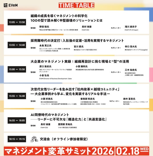 マネージャーイネーブルメントサービスを提供する株式会社EVeM(本社:東京都新宿区、代表取締役:長村 禎庸)は、2026年2月18日(水)、コングレスクエア日本橋にて、「マネジメント変革サミット2026 ーすべての挑戦をエンパワーする」を初開催します。会場参加が抽選制(定員あり)のほか、オンライン参加も可能です。マネジメント変革の最前線を体感できる貴重な機会として、ぜひこの機会にご応募ください。