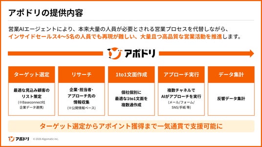 株式会社Algomatic(本社:東京都港区、代表取締役:大野峻典、以下Algomatic)が開発・提供する営業AIエージェント『アポドリ』は、2026年1月15日、Baseconnect株式会社(本社:京都府京都市、代表取締役:國重侑輝、以下Baseconnect)のパートナーシップAPIを経由した企業データ連携を開始し、新機能として提供することをお知らせいたします。本連携により、『アポドリ』上で企業リスト作成が可能となり、ターゲット選定の精度を高めます。ターゲット選定からアポイント獲得までを一気通貫でサポートすることで、企業リストを営業アセットとして蓄積しながらさらなる成果創出を実現します。