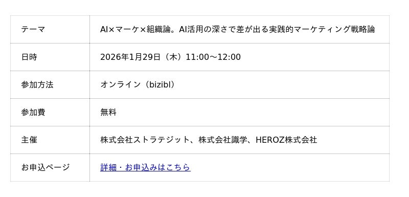 株式会社識学(本社:東京都品川区、代表取締役社長:安藤 広大、以下「識学」)およびHEROZ株式会社(本社:東京都港区、代表取締役CEO:林 隆弘、以下「HEROZ」)と共催で、生成AIの業務活用と組織マネジメントの関係性をテーマとした無料ウェビナー「AI×マーケ×組織論。AI活用の深さで差が出る実践的マーケティング戦略論」を、2026年1月29日(木)に開催いたします。