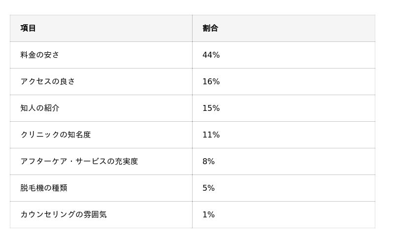 医療脱毛のクリニック選びで重視したこととして、最も多く回答が集まったのは「料金の安さ」で44%でした。