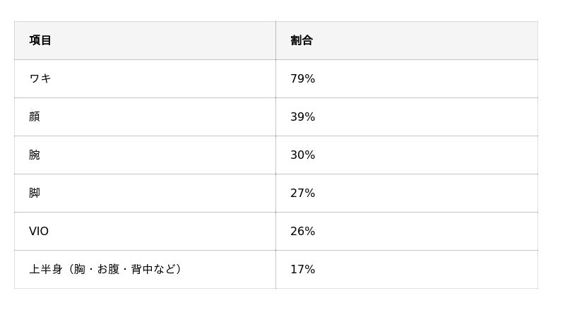 - 医療脱毛を受けた箇所に関する質問では、「ワキ」(79%)を選んだ人が最多