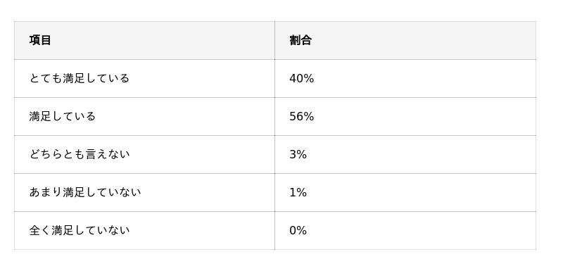 調査では、「とても満足している」と回答した人が40%、「満足している」と回答した人が56%となり、合計96%が施術に満足している結果となりました。多くの回答者が施術に対して前向きな評価を示しました。