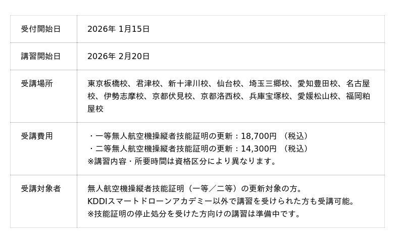 このたび、KDDIスマートドローンが提供するドローンスクール「KDDIスマートドローンアカデミー」において、東京板橋校をはじめとする13校(順次拡大予定)にて、更新講習を提供します。地域で安心安全な運航を担う操縦者をサポートするため、全国各地に展開するKDDIスマートドローンアカデミーのネットワークを活かし、お近くの実施校にて随時、受講申込を受け付けます。