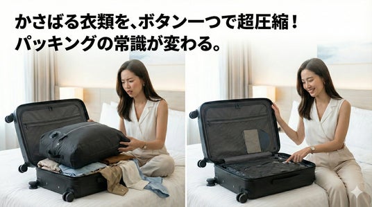 掃除機も別持ちポンプも不要。バッグ一体型の電動ポンプが衣類の体積を約50%圧縮。日米累計2.5億円を調達した次世代スーツケースの収納力を最大化する、最強のオプションアイテム。