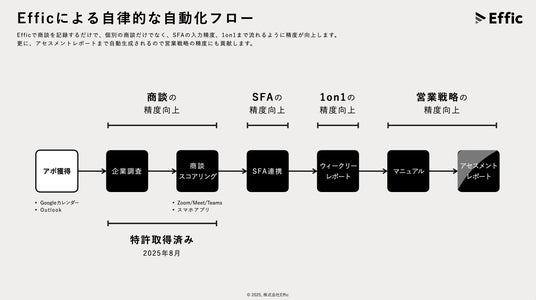 本展示会では、自律型AIセールスエージェント「Effic」の全自動化フローを公開いたします。商談を「記録」するだけで、個別の商談品質、SFAの入力精度、1on1の質、そして営業戦略の精度までが連鎖的に向上する、次世代の営業体験をデモンストレーションとともにご紹介します。