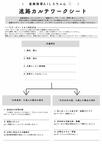 進路指導AI『しろちゃん』の効果を高める「進路カルテ」を公開。ワークシートを使って迷わず進路を検討