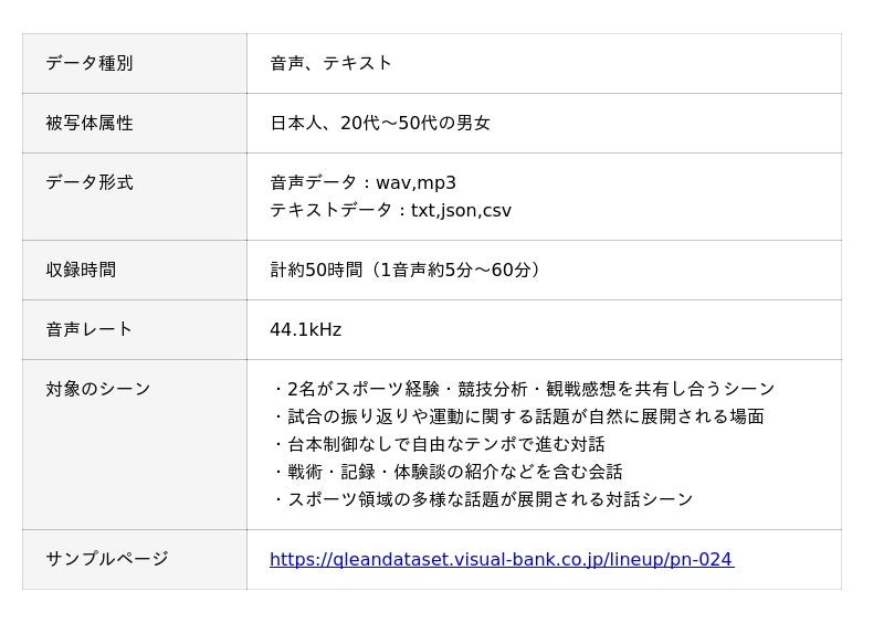 Visual Bank株式会社(東京都港区、代表取締役CEO 永井真之)は、傘下の株式会社アマナイメージズを通じて展開するAI学習用データソリューション「Qlean Dataset(キュリンデータセット)」において、ASR(自動音声認識)、NLP(自然言語処理)、LLMなどの音声・言語系AI開発に向けた「日本語・2話者・スポーツテーマトーク音声コーパスとトランスクリプト」の提供を開始しました。
