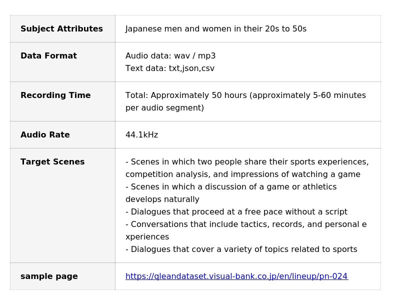 Visual Bank Inc. (Minato-ku, Tokyo; CEO: Saneyuki Nagai) has launched a new dataset through Qlean Dataset, its AI training data solution operated via its subsidiary Amana Images Inc. The newly released dataset, titled Japanese Two-Speaker Sports Dialogue Audio Corpus with Transcripts, is designed for the development and evaluation of speech- and language-based AI technologies, including ASR (Automatic Speech Recognition), NLP (Natural Language Processing), and LLM-driven applications.