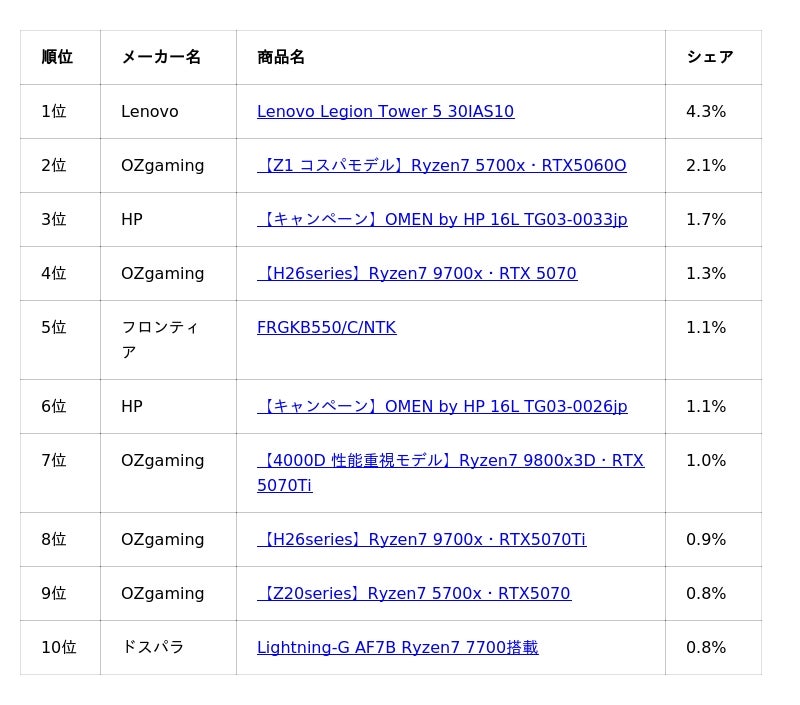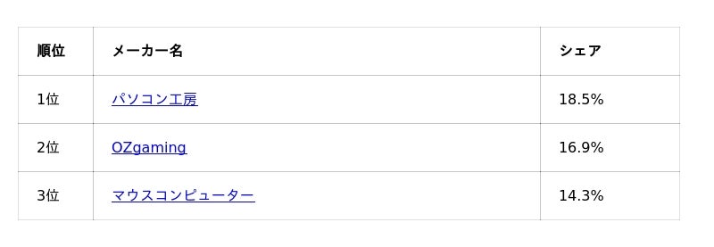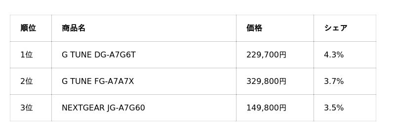3位の マウスコンピューターは、G TUNE・NEXTGEARシリーズの複数モデルが上位にランクインしました。特定の価格帯に偏らず、複数モデルが安定したシェアを獲得している点が特徴的です。