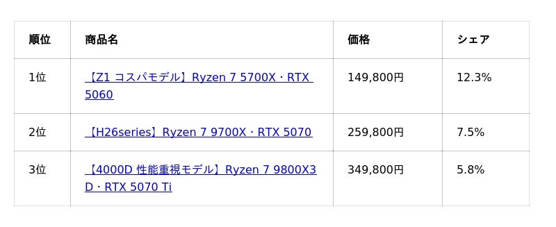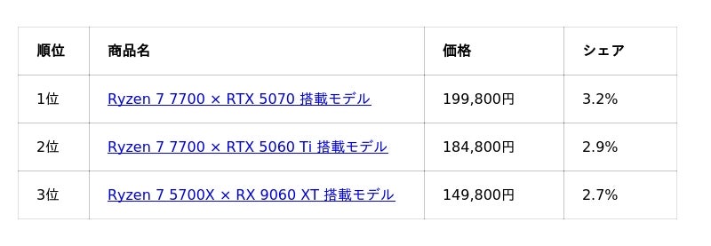 パソコン工房では、20万円前後のミドルクラス構成が注目を集めました。Ryzen 7 × RTX 5070/5060 Ti 構成が上位を占めています。