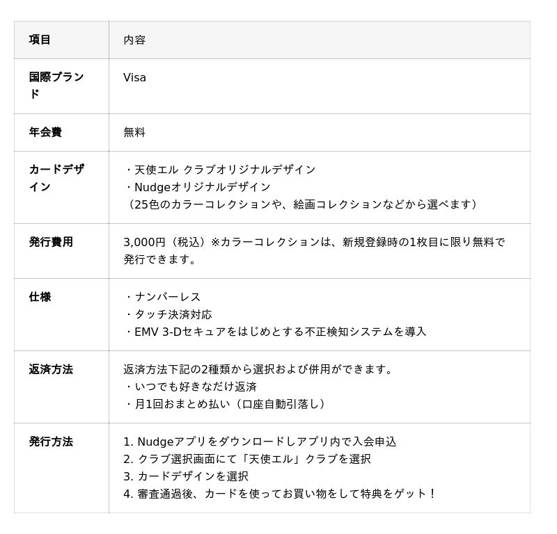 ナッジカードアプリから「天使エル」クラブに入会の上、本カードをご利用いただくと、累計利用額に応じて、天使エルによる本カード会員限定の特別な特典をご提供します。