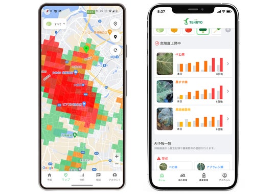 今後、シソ以外の主力野菜への応用も視野に入れ、さらなる研究開発を進めてまいります。また、ミライ菜園では、本技術を現在提供中の病害虫発生予測AIを搭載する防除支援アプリ「TENRYO(テンリョウ)」へ将来的に統合する計画です。TENRYOは、AIが病害虫の発生を予測して適切な農薬散布タイミングを知らせたり、適切な農薬を推奨してくれる「AIドクターアプリ」です。キャベツ、ブロッコリー、といった愛知県で生産が盛んな野菜のほか、柑橘類など13種の農作物に対応しています。本技術の開発により、「予測」から「診断」、そして適切な「対処」までを一気通貫でサポートする、防除に特化したデジタルプラットフォームの構築を目指し、今後、シソ以外の主力野菜への応用も視野に入れ、さらなる研究開発を進めてまいります。