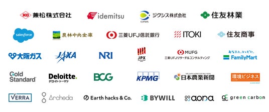 Green Carbon株式会社、国立研究開発法人宇宙航空研究開発機構(JAXA)、大阪ガス株式会社、デロイト トーマツ ベンチャーサポート株式会社、Gold Standard、Verra、兼松株式会社、農林中央金庫、株式会社ファミリーマート、日本農業新聞、株式会社イトーキ、KPMGコンサルティング株式会社、ジクシス株式会社、住友林業株式会社、環境ビジネスオンライン、株式会社東京証券取引所、三菱UFJリサーチ&コンサルティング株式会社、株式会社野村総合研究所(NRI)、株式会社セールスフォース・ジャパン、ボストン・コンサルティング・グループ(BCG)、出光興産株式会社、住友商事株式会社、三菱UFJ信託銀行株式会社、日本経済新聞、株式会社Archeda、Earth hacks株式会社、株式会社バイウィル、株式会社aora