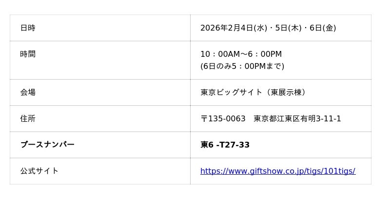 株式会社MOTTERU(本社:神奈川県海老名市、代表取締役:櫻田 良太、以下 MOTTERU)は、2026年2月4日(水)~6日(金)まで、東京ビッグサイトにて「第101回 東京インターナショナル ギフト・ショー 春2026」(以下、ギフト・ショー)に出展いたします。
