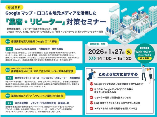 Asantech株式会社は、株式会社西日本新聞社、株式会社マイティーエースと共同で、地域ビジネス向け「集客・リピーター対策セミナー」を2026年1月27日(火)にオンラインにて無料で開催します。