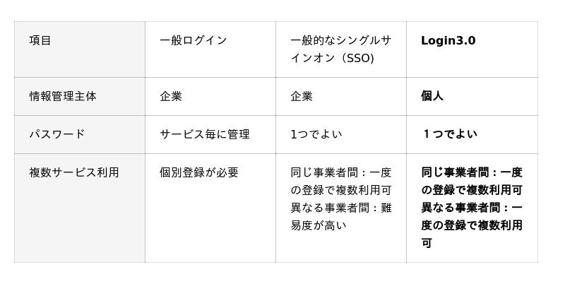 Login3.0は一般的なシングルサインオン(SSO)※3と同等の安全性・利便性を持ち、安全性・利便性双方の観点で一般ログインより優位。さらにLogin3.0は、一般的なSSOと異なり、事業者を跨いだ複数サービス利用も可能。