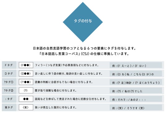 - 6種のタグ付与による高度なアノテーション フィラー(えー、あのー等)や言い間違いに対し、6種類の属性タグを付与。特定の音声事象のみを抽出した効率的な学習を支援します。