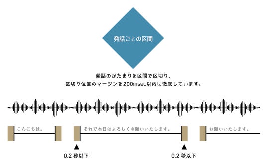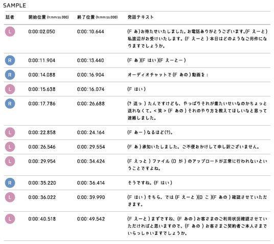 - 発話セグメント単位のタイムスタンプ 発話単位で区間を区切ってデータ化。特定の区間のみをピンポイントで利用・分析できる柔軟なデータ構造を実現しています。