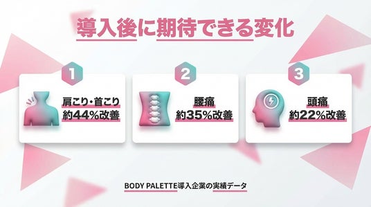 BODY PALETTE導入企業では、継続的なオンライン運動と健康動態モニタリングの実施により、肩こり・首こり 約44%改善、腰痛 約35%改善、頭痛 約22%改善といった改善が確認されています。