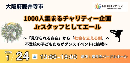 株式会社NIJIN(本社:東京都江東区、代表取締役:星野達郎)が運営する不登校オルタナティブスクール『NIJINアカデミー』は、2026年1月24日(土)に藤井寺パープルホールで開催される1000人来場予定の『DANCE STAR challenge 2026』にて、不登校の子どもたちがJrスタッフとして運営に参加する機会を創出いたします。