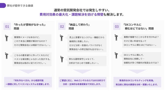 「課題に対して何を作るべきか」「目的を達成するためにどのように改善すべきか」といった上流工程から整理し、開発から改善までを一貫して支援しています。