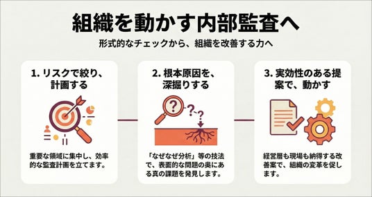 株式会社リスキルは、組織の課題解決に向けた「内部監査実践力強化研修」の提供を開始します。本研修は、従来の形式的なチェック業務から、リスクに基づき経営に資する監査への転換を目指すものです。受講者はリスクベースの計画策定から、なぜなぜ分析を用いた根本原因の特定、経営層を動かす改善提案までを体系的に習得します。組織の健全な成長を支える、実効性の高い内部監査の実現に寄与します。