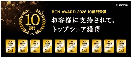 エレコム株式会社(本社:大阪市中央区、取締役社長執行役員:石見 浩一)は、株式会社BCN主催の「BCN AWARD 2026」において、『キーボード』、『マウス』、『モバイルバッテリ・充電器』、『スマートフォンケース』、『スマートフォン保護シート』、『タブレット端末アクセサリ』、『サウンド関連ボード』、『携帯オーディオアクセサリ』、『10キーボード』、『映像関連ボード』の全10部門で最優秀ベンダーを受賞しました。