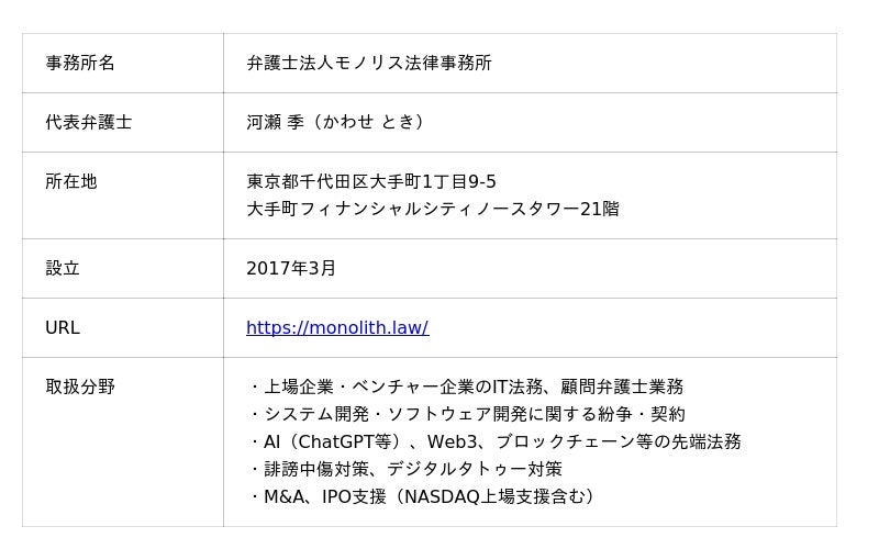 IT・インターネット・ビジネス領域に特化した弁護士法人モノリス法律事務所(東京都千代田区、代表弁護士:河瀬 季)は、企業の生成AI(ChatGPT等)活用におけるガバナンス構築支援を強化するため、AI法務チームの体制を大幅に拡充いたしました。