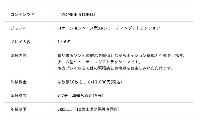 『ZOMBIE STORM』は、VRヘッドセットを装着し、実際の空間を歩きながらゾンビと戦う「ロケーションベース型XR」を採用した没入型アトラクションです。1~6名で同時にプレイ可能で、友人や家族、グループでの体験をお楽しみいただけます。