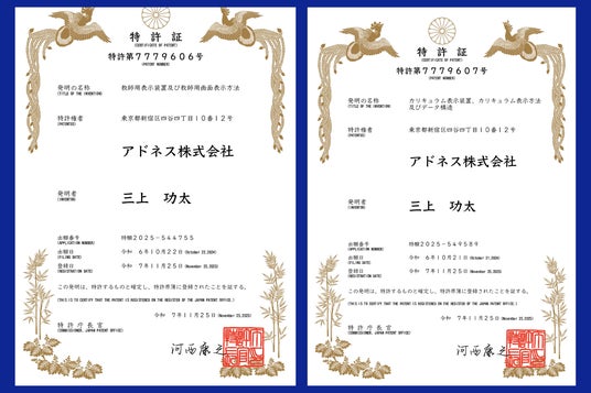 生成AIイノベーションのグローバルリーダー、アドネス株式会社(本社:東京都新宿区四谷、代表取締役社長:三上功太)は、学習者一人ひとりの理解度や進捗に応じてカリキュラムが変化する特許技術(特許第7779606号・7779607号)を取得しました。本技術により、従来の教育現場における課題であった「指導の属人化」を解消し、講師の経験やスキルに依存することなく、すべての学習者に最適化された教育体験の提供を可能にします。