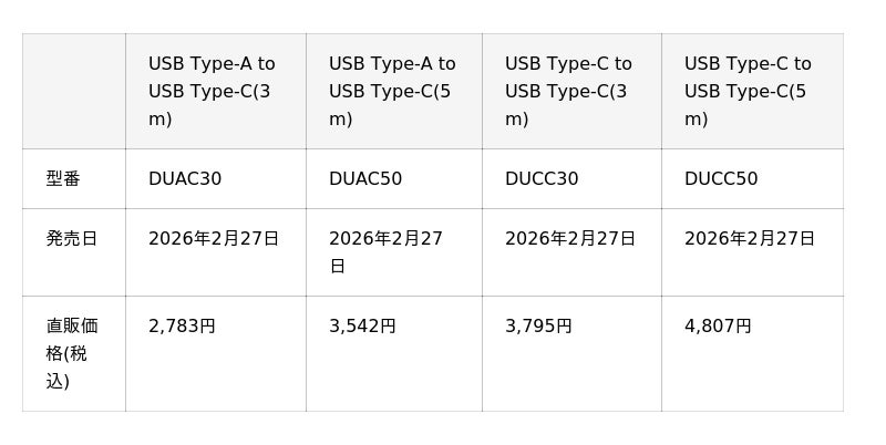 FA機器ハーネス・産業用ネットワーク製品を提供するダイヤトレンド株式会社(本社:大阪府大阪市、代表取締役 宮下清哉、以下ダイヤトレンド)は、表示器GOT3000シリーズ等、最新の三菱電機製FA機器とパソコンを接続する用途に最適化した産業用USBケーブル4種を2026年2月27日に発売いたします。接続コネクタ(Type-A/Type-C)と長さ(3m/5m)のバリエーションを用意し、USB Type-AとType-Cを接続する「DUAC30」「DUAC50」と、USB Type-C to Type-Cを接続する「DUCC30」「DUCC50」を展開。動作確認済みのため、産業用現場でも安心してご使用いただけます。