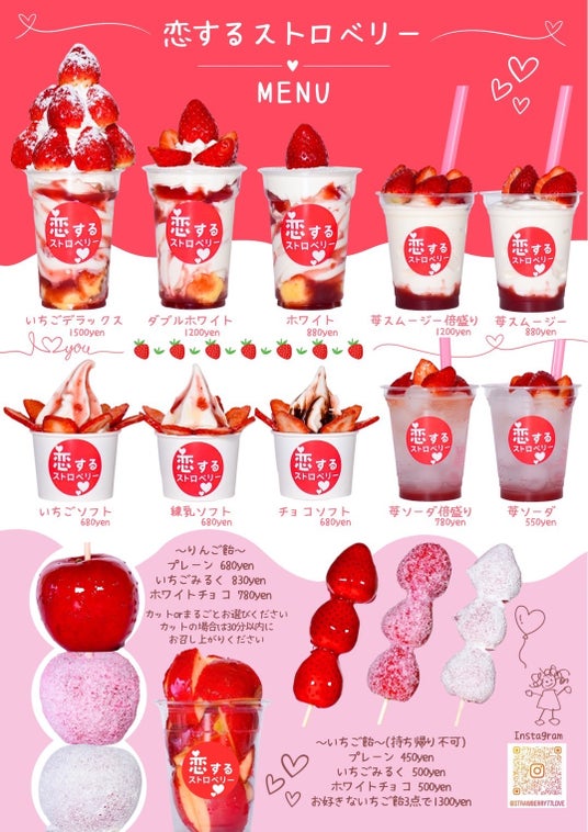 苺の美味しさをギュッと詰め込んだスムージーやソーダなどのドリンクメニュー、パリッとした飴で丁寧にコーティングしたいちご飴など、思わず写真を撮りたくなるような可愛らしいスイーツを取り揃えております。