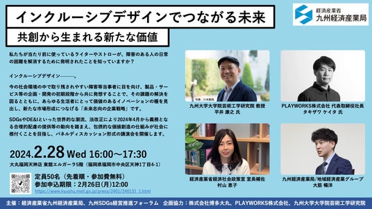 インクルーシブデザイン・コンサルティングファーム PLAYWORKS株式会社(本社:東京都目黒区 代表取締役:タキザワケイタ)は、九州経済産業局、九州知的財産活用推進協議会、九州SDGs経営推進フォーラムが主催するシンポジウム・展示交流会 「インクルーシブデザインで広がる新たな市場と企業価値」(2026年2月10日、福岡市)において、代表取締役 タキザワケイタが基調講演に登壇することをお知らせします。