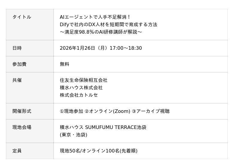 2026年1月26日(月)に「AIエージェントで人手不足解消!Difyで社内のDX人材を短期間で育成する方法~満足度98.8%のAI研修講師が解説~」セミナーを開催(池袋会場&オンライン配信)