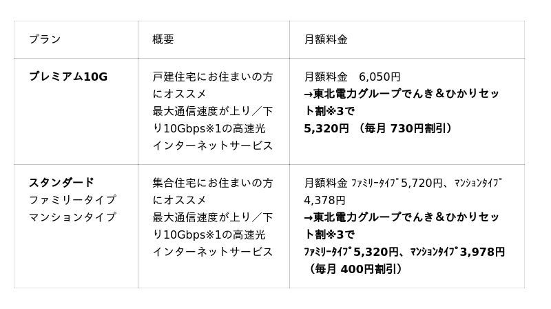 東北電力株式会社(以下 東北電力)の自由料金プランや当社の電気のご契約をされているお客さまには、「東北電力グループでんき&ひかりセット割」※3により、「東北電力フロンティア光」の月額料金から、「プレミアム10G」は730円、「スタンダード」は400円を毎月割引いたします。
