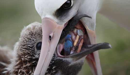 親鳥がヒナに与える餌に、プラスチック片が混入している様子。 Chris Jordan's ALBATROSS film