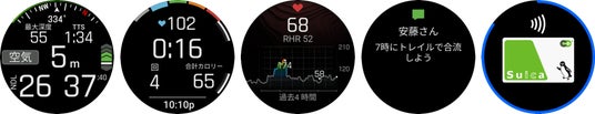 左から、ダイビング、筋トレ、心拍計、通知機能、Suica