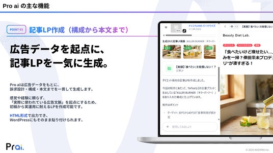 株式会社KASHIKA(本社:東京都大田区、代表取締役:小澤健太)は、広告分析ツール「DPro」に蓄積された膨大な広告データを活用し、広告運用の実務を劇的に効率化する生成AI機能「Pro ai(プロアイ)」をリリースいたしました。 「Pro ai」は、単なる画像生成やテキスト作成にとどまらず、実際に成果が出ている広告の構成・訴求・デザイントレンドを学習しています。これにより、バナー生成、記事LPの構築、市場動向レポートの作成といった、高度なマーケティング業務を一気通貫でサポートします。