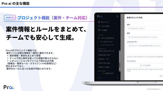 Pro aiのプロジェクト機能では、案件ごとに必要な情報を一箇所に集約できます。商材情報・素材をまとめて管理でき、チームで同じ案件を扱っても情報が散らかりません。さらに、薬機法・業界ルール・クライアントNG表現などのレギュレーションをファイルで読み込み可能。売れるだけでなく、案件のルールに沿った生成が可能になります。