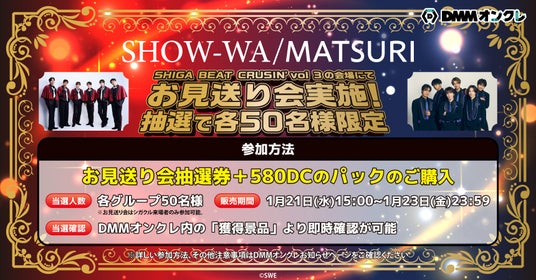 合同会社DMM.com(本社:東京都港区、PFカンパニーCEO:村中悠介、以下DMM)が提供するオンラインクレーンゲームサービス「DMMオンクレ」は2026年1月24日(土)開催『SHIGA BEAT CRUISIN’ Vol.3』出演アーティストのSHOW-WA・MATSURIのオリジナルグッズを、2026年1月23日(金)18:00より展開します。