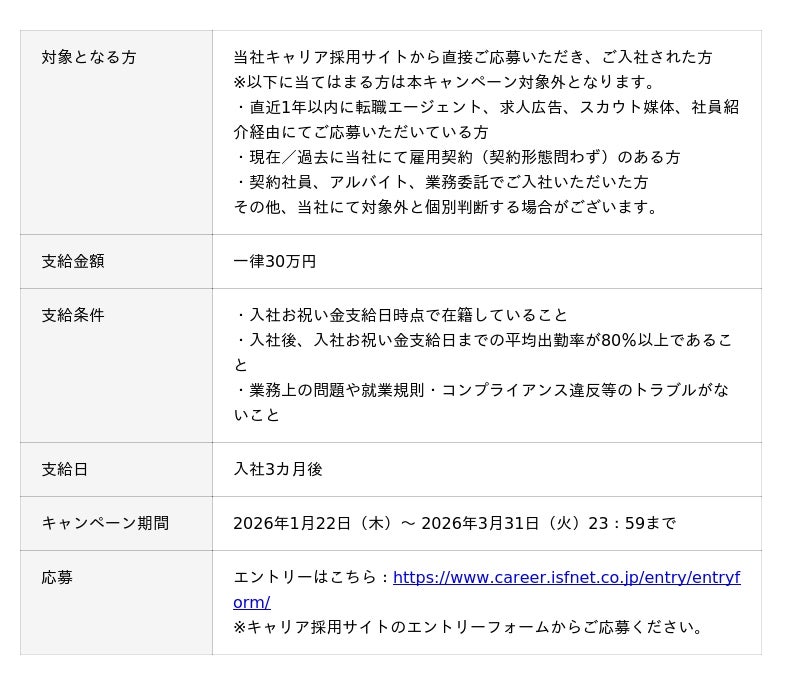 株式会社アイエスエフネット(本社:東京都港区/代表取締役:渡邉幸義、以下アイエスエフネット)は、ITインフラエンジニアの採用を強化するため、2026年1月22日から3月31日までの期間に、入社お祝い金キャンペーンを実施いたします。