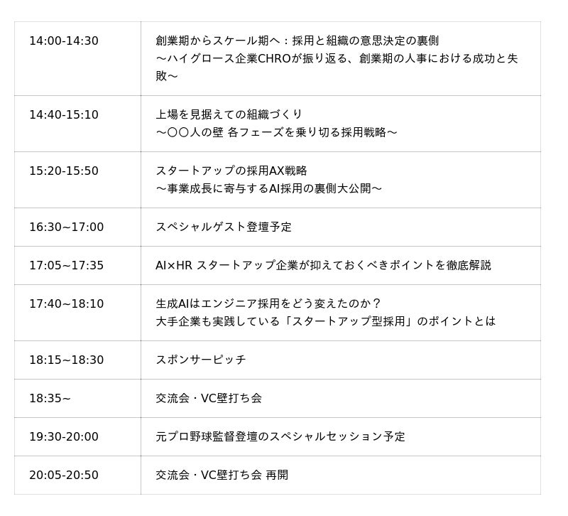 「創業初期の採用基盤構築」「上場を見据えた組織づくり」「VCとスタートアップの連携」「採用におけるAI活用」「強いエンジニア採用」の 5つの視点から、採用~組織づくりにおいて抑えるべき最前線を紐解いていきます。