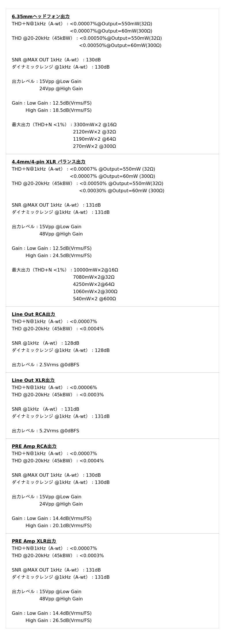 出力系統:6.35mmヘッドホン出力端子 / 4ピンXLRバランス出力端子 / 4.4mmバランス出力端子