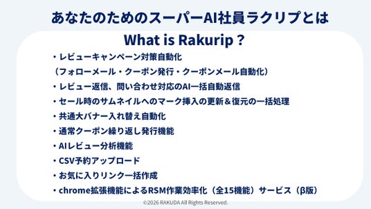 今回リリースしたラクバナに加え、すでにリリース済のサービスであるレビュー施策の完全自動化機能や、サムネイルの一括更新予約・復元機能、AIによるレビュー分析・自動返信機能にとどまらず、今後もEC運営を総合的に支援する“エージェント機能”を順次スピード感をもって拡充してまいります。