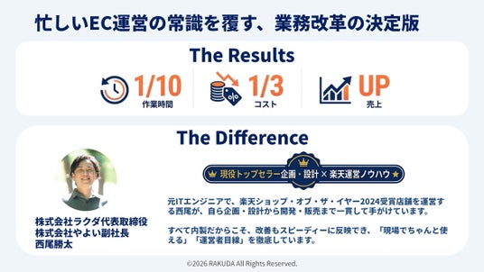 代表取締役 CEO兼CIO 瀬尾健太楽天市場の運営現場には、重要でありながら、長年「人がやる前提」で放置されてきた作業が多く存在します。