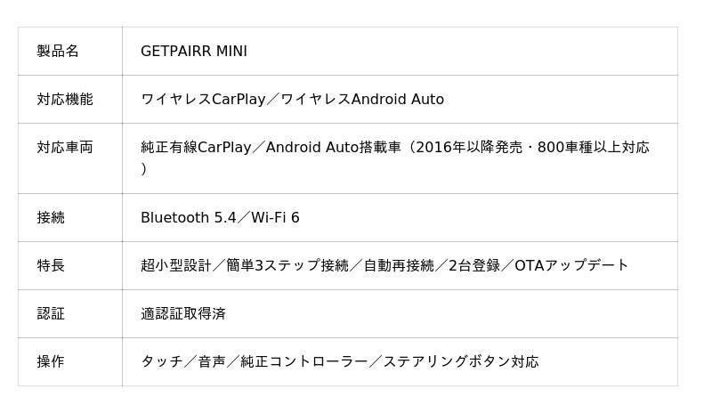 GETPAIRR MINIは、2016年以降発売の「純正有線CarPlay/Android Auto」搭載車を対象に、800車種以上に対応しています。