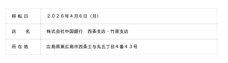 中国銀行(岡山市 頭取 加藤 貞則)では、2026年4月6日(月)に西条支店および竹原支店を新築移転し、ちゅうぎん広島北ローンセンターを営業店併設型の「ちゅうぎん西条ライフプランセンター」として移転いたします。